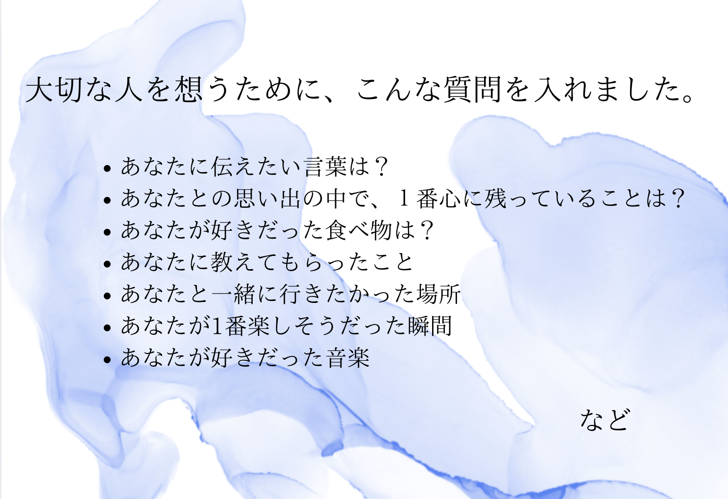 ■ 質問は100通り。感謝・思い出・未来への想いをカタチにできる内容です